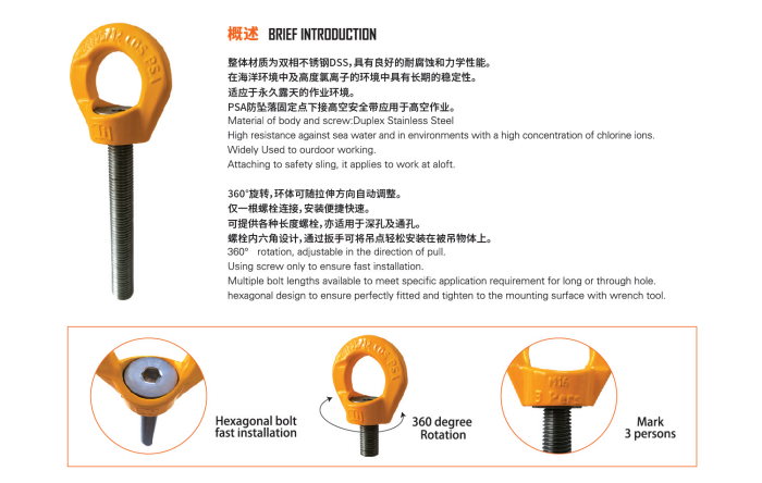 PSA-16防坠落固定吊点360°旋转,环体可随拉伸方向自动调整,仅一根螺栓连接,安装便捷快速,可提供各种长度螺栓,亦适用于深孔及通孔。螺栓内六角设计,通过扳手可将吊点轻松安装在被吊物体上。