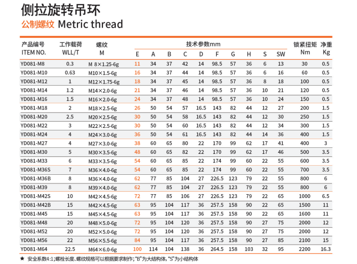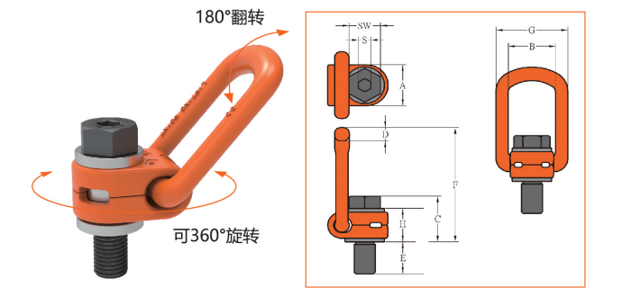 冠航YD081-M8侧拉旋转吊环的设计允许在水平方向上进行360度旋转和垂直方向上的180度翻转,提供了更大的灵活性和自由度。YD081侧拉吊环可以用于连接各种索具,使连接点在各个方向上都具有灵活性,适应不同的吊装需求。在需要旋转的设备或机械结构中,侧拉旋转吊环可以作为连接点,提高操作效率。