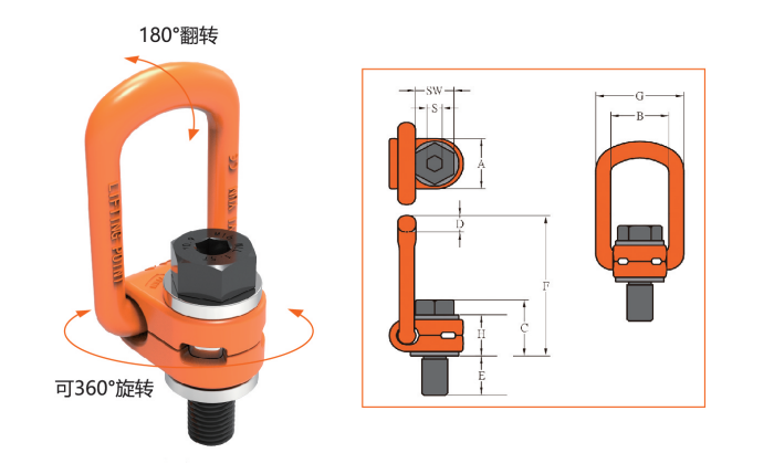 YD081-5/16Unc侧拉旋转吊环的设计允许在水平方向上进行360度旋转和垂直方向上的180度翻转,提供了更大的灵活性和自由度。这种吊环可以用于连接各种索具,使连接点在各个方向上都具有灵活性,适应不同的吊装需求。在需要旋转的设备或机械结构中,侧拉旋转吊环可以作为连接点,提高操作效率。