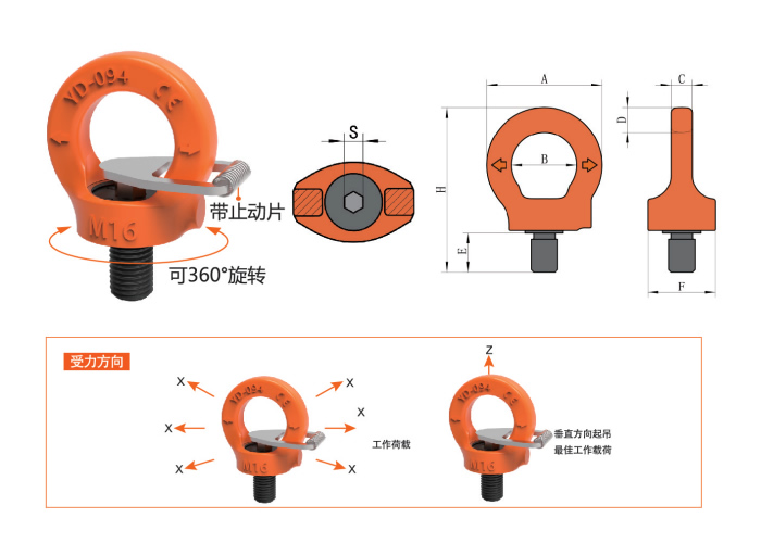 冠航眼型旋转吊环通常由一个环和一个眼型接头组成,它们之间通过球形滚珠或滚柱连接,能够实现水平360度旋转和垂直180度翻转,提供更大的灵活性和自由度。
